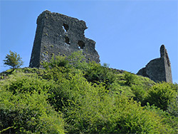 Unlike Dinefwr, not so much remains, the majority having been deliberately destroyed early in the 15th century, but two sections of wall survive to near their full height, and much of the structure is clearly evident from foundations. The castle was relatively important in its time, and is notable for the intricate design; the only castle built by a Welsh native to have three wards - outer, middle and inner - together occupying all of the flattish land on the narrow, slightly elongated hilltop, which extends about 300 feet, from the outer gatehouse in the northeast to the great hall and accommodation block in the southwest, closest to the river.
