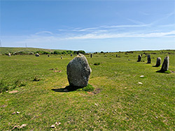 The close, linear grouping of the three Hurlers circles is unique in the UK. The northern circle has 15 visible stones and ten buried, while the central circle, the best preserved, has 14 visible and 14 buried. The southern circle is the least well preserved and has never been excavated; it has nine visible stones, most of which are fallen. Other circles also have some fallen stones, a situation exacerbated by the introduction of cattle in the last few decades, who use the stones to rub against.