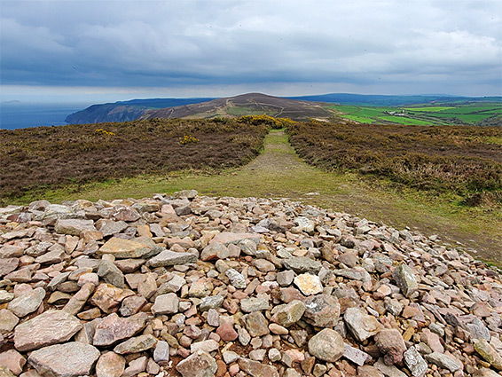 The coast path climbs again to the 716 foot summit of Little Hangman, which is reached by a short spur. Sandstone ledges just below to the north provide good places to shelter and look out over the vastness of the sea beneath. Further east, the trail is fairly level for a while then begins its long ascent to Great Hangman, gradually steepening as it nears the top, which is marked by a huge cairn. Far below are more inter-tidal sands and rocks, Blackstone Beach, this completely out-of-view, and reachable only by boat. After Great Hangman, the coast path is forced inland quite a way to avoid the steep lower end of Sherrycombe, and it is two thirds of a mile from the coast at the point where it crosses this valley, en route to Holdstone Down and then to Heddon's Mouth.