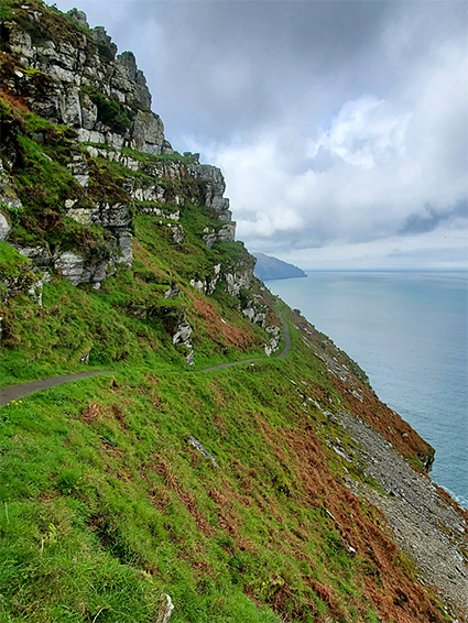 Turning right (west), North Walk soon exits the woodland for the open slopes that extend to the Valley of Rocks; this is the best section of the hike, passing below slate cliffs and across precipitous scree slopes, with long-distance views all around. There is one junction along the way, at Middle Gate, where a path climbs to a pass and descends to the road through the valley, then a little further the main route also turns inland, through a similar gap, between two named formations, Rugged Jack to the east, Castle Rock to the west, both of which can easily be climbed, and provide many good photographic opportunities.