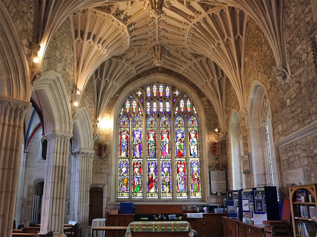 Stained glass window and fan-vaulted ceiling of the Dorset aisle, on the north side of the nave