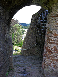 A stepped path ascends the north face of the motte to the gated doorway of the keep, allowing access to the circular interior, which contains the earlier tower foundations but is otherwise empty, though six corbels projecting from the wall to the northwest indicate the previous existence of an interior room. Either side of the doorway, inside the walls, are two short series of stone steps leading to the wall walk, which extends a full 360 degrees around the top of the keep, protected on the inside by modern railings. The battlemented walls survive to their full height, and the regular gaps allow commanding views across the River Dart valley. Some of the upper sections of the walls are pierced with arrowslits, some cross-shaped, others merely vertical. The only other feature inside the keep is an enclosed room, or garderobe, contained within the southern wall, illuminated by two arrowslits, one having been enlarged to make a small window.