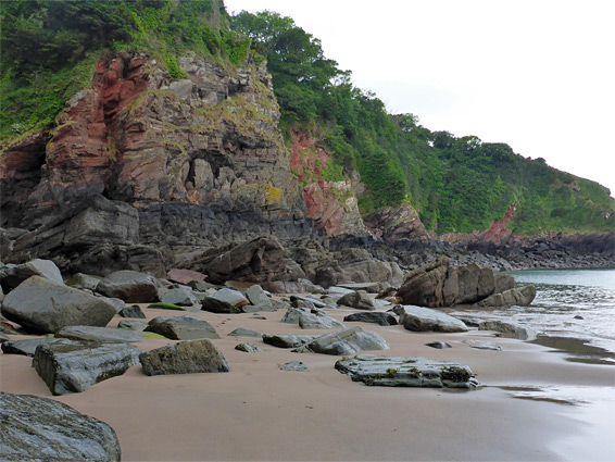 After the turn-off to Wringcliff Bay, the coast path continues close to the cliff edge for a little way before turning south at a private gate and meeting the road again, at the east edge of the Lee Abbey estate, beside an elegant stone gatehouse, which adjoins the Beacon Outdoor Activity Centre. The road moves inland, and the adjacent section of the coast is privately owned, out-of-bounds to the public; the next accessible part is just over half a mile further, past the abbey - a grand-looking building built in the 1850s - to the cottage at Lee Bay, location of the other parking area. Here, a short road descends to the sea and to a sheltered, sand and gravel beach lined by extensive, slippery rocks at low tide, backed by tall cliffs, mostly coloured grey but enlivened some patches of red. Low water levels allow some of the neighbouring coast to be explored, westwards to the next promontory, Crock Point, and northeast to Jennifried's Cove and the impassible Duty Point.