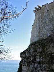 Rufus Castle is one of two ancient fortifications on the Isle of Portland, and very different to the other, the much better known Portland Castle, built in 1541 by Henry VIII to protect Portland Harbour. The origins of Rufus are much older, as the first castle on the site was erected in the late 12th century, for William II (whose nickname was Rufus owing to his red hair), though nothing remains of this, and instead the visible ruin dates from the mid 15th century, when the fort was rebuilt, under the command of Richard the 3rd Duke of York. This later castle consists of an irregularly five-sided tower, at the edge of a cliff on the east side of the island, above a sheltered pebble bay, Church Ope Cove; quite a dramatic location, enhanced by tall trees along the cliffs, shielding the site from the nearby more recent buildings.