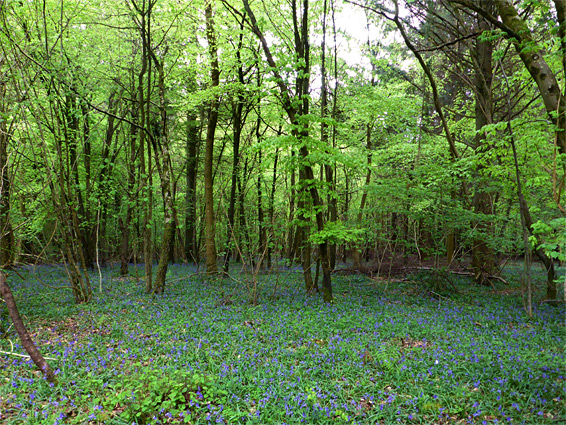 Perhaps the best way to see the woods is to walk along the crest of the ridge and return via the path across the southern slopes. The ridgetop path first passes through dense patches of bluebells, most colourful in April and early May, then enters a more open area with generally less tall trees, where a short spur leads north to a bench and viewpoint. Around here is an extensive grove of lily-of-the-valley, its position marked on the map at the nature reserve entrance, though the plant is also common in many other areas. The trail then descends gradually to a four-way junction near the west side of the wood; north leads to Holy Brook, straight on drops down a little more to Whitehall Bridge over the River Frome, while south then east is the return route, through generally more overgrown surroundings. This path also comes close to an old quarry, a roughly circular excavation lined by steep slopes topped by cliffs of pale-coloured limestone. Several short connectors link with the Sapperton Valley path below, alongside the old canal.