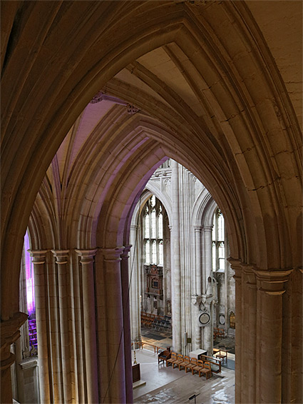 Entry to Winchester Cathedral for visitors is through a doorway at the northwest corner, a point just within the former Old Minster, the outline of which is traced by brickwork in the adjacent grounds. The door opens to the north aisle of the massive, eleven-bay nave, its original Norman columns encased by perpendicular Gothic cladding from the late 1300s. Beyond the nave is the crossing, beneath the tower, flanked by the north and south transepts, the east and west walls of which are lined by monuments and chantry chapels. The choir is positioned directly beneath the tower and contains original wooden stalls from the early 1300s, said to be the best preserved in Europe. Beyond the chancel is the presbytery, the retrochoir and finally the lady chapel, either side of which are two of the larger chantry chapels, dedicated to the Guardian Angels and Bishop Langton. Beyond the south wall of the south transept are two remnants of the former monastic outbuildings, largely demolished in 1539 - a slype (covered passageway) and part of the framework of the chapter house, including a short colonnade that once faced the cloisters, to the west, on the south side of the nave.