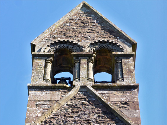 The church at Kilpeck was constructed in about 1140, probably on the site of an earlier Saxon religious building. Its structure is simple; a nave leading to a chancel and a semicircular apse, with a wooden gallery above the nave, but it is made especially notable for the original, high quality, well preserved and varied stone carvings, in particular around the main doorway, at either side of the west window, along the chancel arch, and under the eaves of the roof. The building has remained largely unaltered ever since the Norman era, apart from limited restorations in the 19th and 20th centuries; the only major addition was a belltower above the west front, placed here in Victorian times. It is thought that population decline, in part due to the Black Death of the 1340s, led to the village being isolated and somewhat forgotten, hence the church was never modified or damaged.