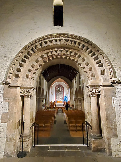 The main doorway opens into a porch, below a square tower from the 15th century, perpendicular Gothic in style, its upper reaches accessed by a spiral staircase at one corner. The porch leads to the lady chapel, also known as St Mary's chapel, the walls of which are mostly from the 13th century but include a few pre-conquest sections. A stone font is positioned just beyond the entrance, probably incorporating part of a Norman original though the majority was constructed in Victorian times. The chapel marks the original church of St Gwynllyw, which was rebuilt in stone around 1000, and it may even still contain the king's tomb. The chapel is linked to the main part of the church by the most famous feature in the cathedral, the ornate semicircular doorway, or portal, built in Norman times in the Romanesque style, adorned with deeply incised chevrons. Beyond is the nave, lined by north and south transepts, each delineated by four Norman circular columns, plus a porch to the south. The walls of the nave are from the 15th century. At the east end of the cathedral is the chancel, linking with several other rooms, all dating from mid 20th century modifications, after designation of the building as a cathedral.