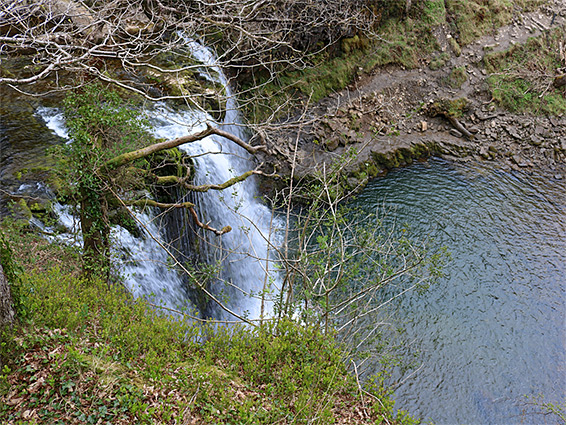 The river moves round a bend, straightens out and becomes a bit less scenic, with just a few more cascades and some low cliffs, and is also harder to follow at water level without getting wet feet - it is easier, in some places, to traverse the slopes above. Nearly half a mile from the tall, reddish cliff, the final pools and cascades lead to the brink of Sgwd yr Eira, where the river drops 50 feet over a sandstone ledge. The drop can be viewed from either side, after carefully crossing a little way upstream, while other viewpoints are to the north, just past the falls and a little way above, from where a faint path leads downstream.