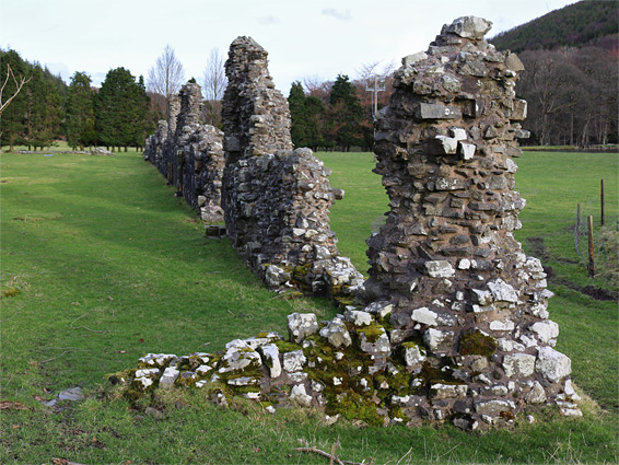 The church walls are constructed out of limestone and quartzite rubble, now mostly brown to dark grey in colour, and although the cladding is mostly missing, some does survive along the exterior on the south side. The tallest wall fragment is about 16 feet, also to the south; the north wall is lower and less complete. The lower portion of three cylindrical shafts survive, two along the south wall and one to the north, as do the diamond-shaped bases of three arcade columns and the two piers of the crossing, linked by the foundations of the later closing wall. Beside this is a modern slate monument to Llywelyn ap Gruffydd (died 1282), the last native prince of Wales, who is buried somewhere in the vicinity. The field beyond the abbey extends to Clywedog Brook, at the foot of a forested hill, part of which conceals an overgrown quarry, possibly used to provide building material for the abbey. Also beside the brook is a photogenic fish pond excavated in Victorian times, containing a small, tree-lined island.
