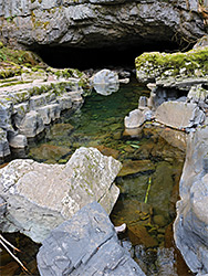 The main path from the parking area heads south, following the river downstream, staying a short distance east, while a side route runs right above the underground section, following the course of an ancient drainage. It passes four more large entrances and several smaller cavities before rejoining the other route shortly before the resurgence - the river emerges via a narrow channel many feet deep with a small waterfall beyond, below a cliff of about 20 feet. Just downstream are a series of sculptured rocks and potholes before the valley sides become wooded and more traditional in appearance.