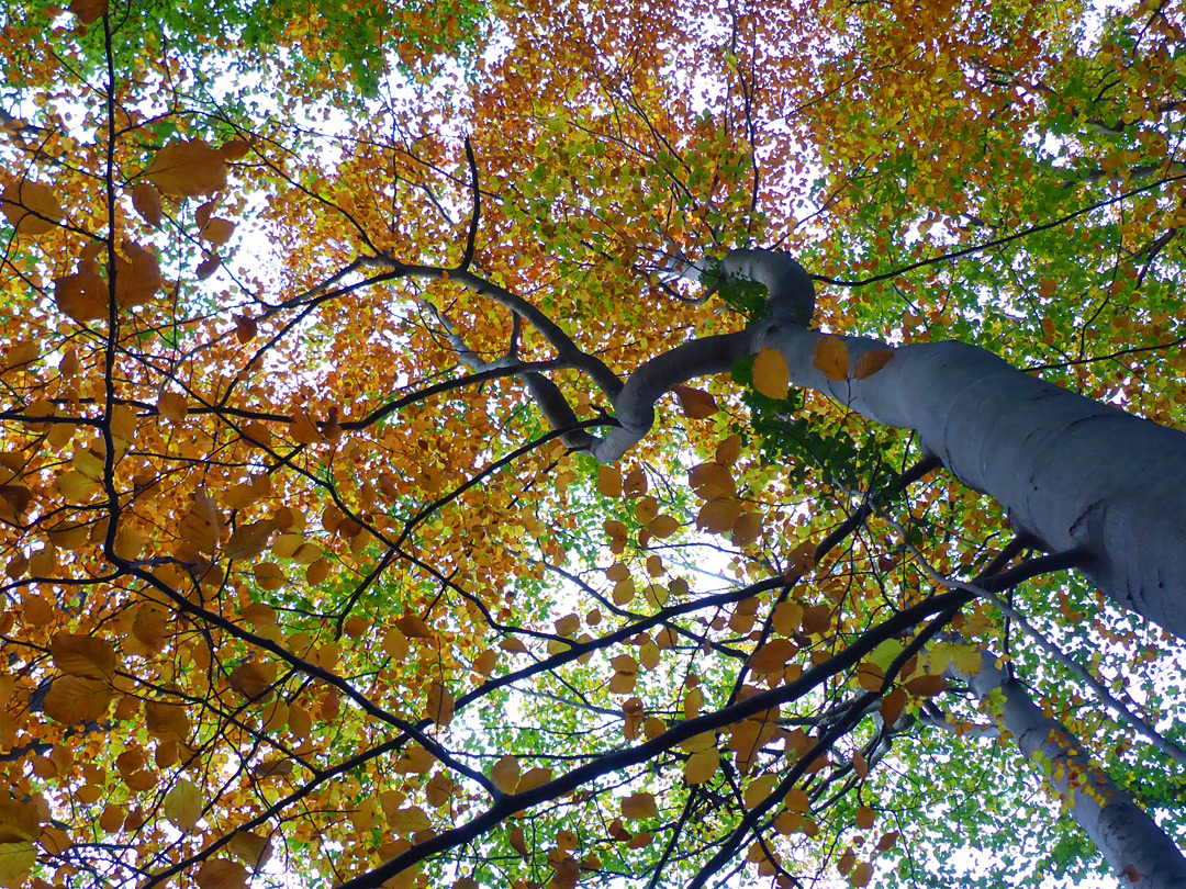 Grey beech trunk, and orange leaves