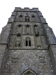 The first church on Glastonbury Tor was a wooden structure, probably erected in the 11th century and largely destroyed by an earthquake in 1275. The foundations were reused around 50 years later when the stone church of Saint Michael was constructed. This was a larger building, 80 feet long and 25 feet wide, with a square tower on the west side and a rectangular nave to the east, the foundations of which do survive, below ground. Traces of subsidiary buildings have been identified to the southeast, including living space for the priest, and probably a bakehouse. The northeast corner of the tower was built in 1804 but the remainder dates from the 14th century. Masonry features include seven narrow niches on the west front, beneath canopies, once containing sculptures. Two survive, an intact effigy of St Dunster, and the base of a statue of St Michael. Below the niches, either side of the wall above the arched doorway, are two square relief carvings. The interior of the tower contains traces of vaulting that one supported the roof and the two intermediate floors.