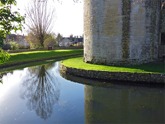 The first view is of the moat and the rear of the castle, centred on the full height southeast-facing wall which, like the four towers, is adorned near the top by a neat row of machicolation - holes between projecting wall supports (corbels) through which defenders could engage potential attackers, though these upper walls (battlements) are all missing, leaving just the projections. The moat creates a fine reflection of the castle in its tranquil, greenish waters. Nunney Brook flows right past to the south, while the other three sides of the site border private residences. A path circles the outer banks of the moat and links with a bridge on the north side, at the site of the original drawbridge entrance; from here visitors proceed through a doorway and porch set in a small, surviving section of the north wall, and on to the interior. Ahead is an array of windows and fireplaces in the south wall, clearly indicating that the castle once had three upper floors. Some of the upper windows retain their original tracery but most are just empty openings. Each of the four towers can be entered at the base, and they also have windows, though only on the upper two levels, hence are rather dark. The interior of the castle is generally rather gloomy since some of the masonry is covered by black staining, and the alignment of the building means that the place is rarely illuminated by the sun. All the site can be seen in just half an hour or so.