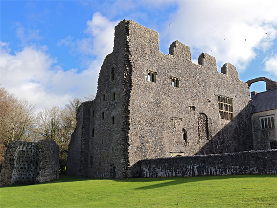 A fortification was built at Oxwich, near the south edge of the Gower Peninsula, in the 13th century or earlier, but the building that stands on the site today dates from the 16th century, constructed in two phases by members of the Mansell family. Although referred to as a castle, perhaps partly because of the previous structure, the place is instead a fortified mansion, or manor house, centred on a rectangular courtyard which is lined by rooms on two sides, up to six stories tall. The large scale and the defensive elements of the house were designed to impress visitors rather than repel attacks, as by the time of its construction south Wales was a peaceful place, free from the campaigns and rebellions of previous centuries.