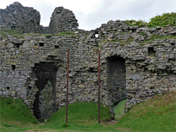 Pennard Castle occupies an approximately oval-shaped enclosure, with the gatehouse on the east side, facing the Burrows; this had a portcullised doorway between two half-circular, three story towers, with a further room above the entrance passageway. A reasonable amount of the north tower survives but the south tower is mostly missing, having collapsed in Victorian times. Only a 20 foot-long segment of the south curtain wall remains, yet all of the north wall is still standing, up to 15 feet tall, linking the gatehouse with the small, circular, northeast mural tower, which contains a single arrowslit, and adjoins the larger, rectangular west tower, probably used for additional living space. There is no trace of the great hall that once stood near the centre of the site.