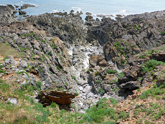 The westernmost of the four nature reserves is Long Hole Cliff, and here the lower path continues close to the sea, passing beneath another prominent rocky summit and past a narrow inlet, which has a hole on the far side, this the upper end of a 60 foot-long sea cave, explorable from below after carefully climbing down the jagged rocks. Nearby is a larger and higher cave, not visible from the path, and when excavated in 1861 this was found to contain many relics from Palaeolithic times. The path leads beneath another dramatic rocky peak and past an section of the intertidal zone with particularly intricate rock formations, all of the grey limestone, lined by a band of reddish conglomerate just above the high water mark, containing another short cave, Boundary Gut, named after a nearby dividing wall. This is at the far side of the nature reserve though it is worth walking at least another 700 feet, over a minor ridge and onto a higher divide which has far-reaching views both east towards Port Eynon, and west to Worm's Head, 3 miles distant.