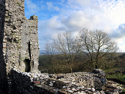 Weobley Castle is managed by Cadw, and is unstaffed, though an entrance fee is required, paid into a box in a room of the adjacent farmhouse. The site is reached by a narrow lane on the west side of Llanrhidian, parking beside the farmhouse drive. A nearby footpath descends a slope then runs along a field at the edge of the estuary, passing directly below the castle and offering some limited views of the northern walls, though trees obscure most of the building. The first part of the trail passes an old, overgrown quarry, presumably the source of building materials for the manor. A good if more distant view of the castle is obtained by walking further north, along an old causeway that runs for over a mile across the marshy flats.