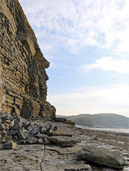Dunraven Bay, also known as Southerndown Beach, is the most visited location along the Glamorgan Heritage Coast, a 14 mile section of the shoreline of Vale of Glamorgan in south Wales, similar in grandeur and geological interest to the Jurassic coast of Devon and Dorset, though rather less known. The designated section runs from Ogmore-by-Sea in the west, adjoining a large area of dunes beside the River Ogmore, and St Athan in the east, and is characterised by tall, vertical cliffs of thin-layered limestone and shale, coloured grey to yellow and brown, above wide beaches of either grey pebbles, golden sand or terraced rock, this latter where the slightly inclined strata have been eroded by the waves to form straight or curving ridges, and other more irregular formations.