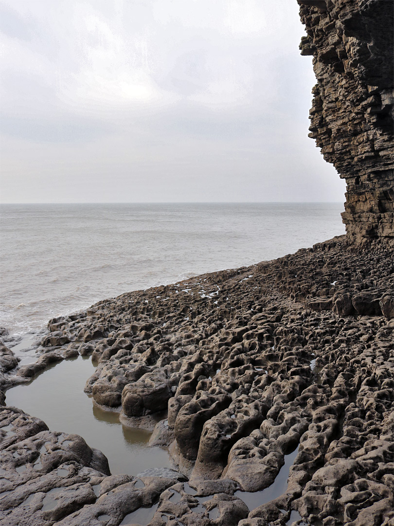 Uneven rocks at low tide, at the foot of a cliff