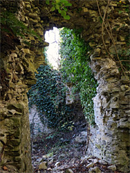 Penmark is a quiet village on a ridge between the River Waycock and a smaller, unnamed drainage, both tributaries of the River Kenson, which flows past a short distance west, and both form relatively deep and narrow valleys, hence the settlement has good natural protection. The castle was built towards the end of the 13th century by the baronial de Umfraville family, and at its peak consisted of an oval-shaped inner bailey 210 feet across enclosed by curtain walls with various rooms and towers at intervals, adjoining an outer bailey on the west side. The ruins are only fragmentary - a section of the western wall leading to a turret and a two story tower, plus part of a dovecote and overgrown rubble piles from other rooms - but the site is still interesting, and quite evocative. Views are somewhat limited because of the vegetation, as the ruins are mostly covered by ivy, and the woodland in the river valley conceals the castle from the north.