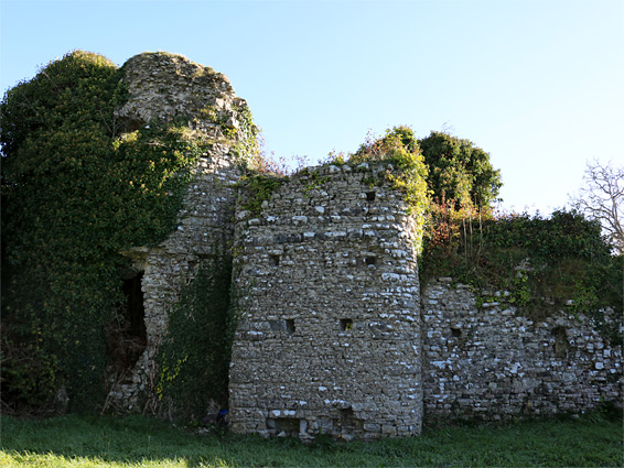 The north side of the field, bordering the Waycock river valley, is lined by a wall of relatively recent construction, leading to the remains of a 13th century dovecote at the northwest corner. The other end of the wall connects with the main surviving section of the castle, which consists of a 130 foot length of the west curtain wall, the northern part of which meets a rectangular latrine turret beside a D-shaped corner tower. Beyond here, the land slopes steeply down by 60 feet to the river. Other, overgrown masonry remains can just be discerned to the east, on the far side of the inner bailey, including further wall sections and parts of three rectangular rooms. The west wall also incorporates the ruins of a barn, which from the outside at least resembles the rest of the ruin but is in fact a much later building, put up in the 18th century, using material from the now vanished sections of the surrounding walls. The barn had a pair of doors, one cut through the outer castle wall. The northwest tower is still about 25 feet tall, with two arrowloops on the ground floor and two on the upper floor, plus two doorways, both once leading to walkways on top of the curtain walls. On the northwest side of the tower are the remains of another turret, or annexe (a 14th century addition), also originally of two stories, while to the south is the latrine turret, the lower section of which is formed of a vaulted, windowless enclosure, mostly contained within the thickness of the curtain wall.