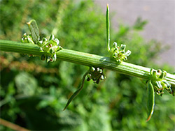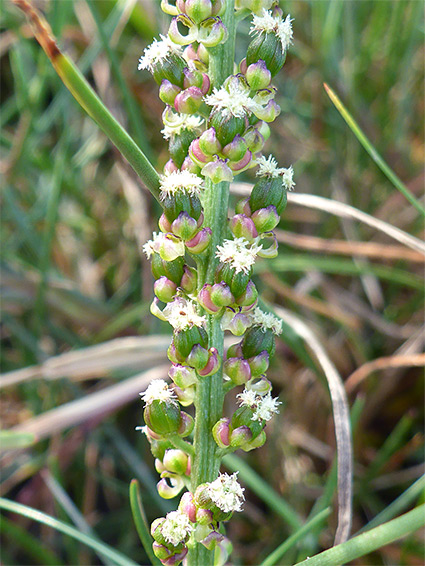 Five thick, green tepals and five short stamens, topped by pale yellow anthers. Flowers form in a narrow, unbranched, elongated cluster, and are subtended by leafy bracts