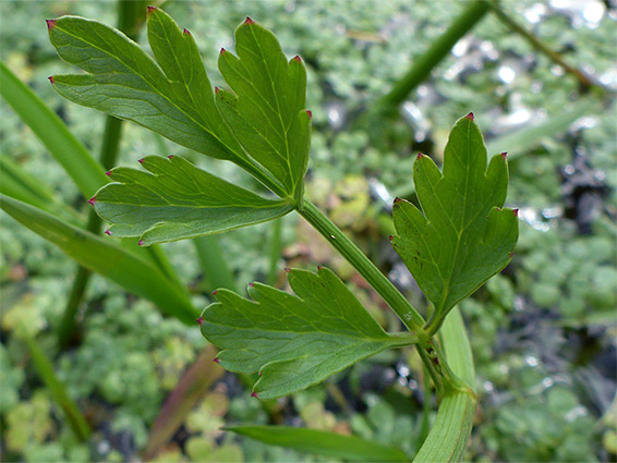 Pinnately divided between two and four times into narrow, oval leaflets with tapered bases and blunt-toothed tips - stem and basal leaves are similar. Leaflet tips are often red