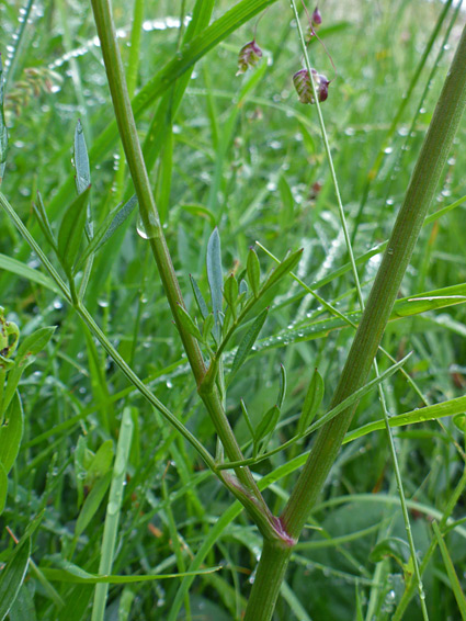 Pinnately divided two or three times into narrow, hairless leaflets, pointed and often reddish at the tip