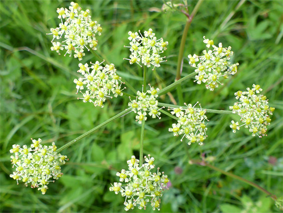Yellowish-white, with widely spreading stamens, in compound umbels (up to 6 cm in diameter) of five to ten long, slender rays, with linear bracteoles beneath the flowers. Bracts are generally absent. The branched stems are solid, ridged and hairless