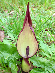 Arranged in an elongated, purple-brown cluster (the spadix), partly enclosed by a yellowish green spathe which is about twice the height of the spadix when mature. The margins of the spathe are tinged purple and its tip is held upwards, not hanging down
