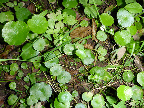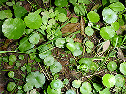 Round, with lightly-scalloped edges; attached at the centre by a sparsely hairy stalk. Up to 5 cm in diameter
