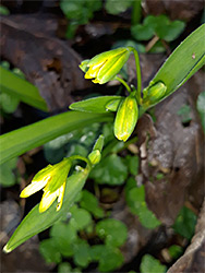 In open clusters of one to seven; 6 tepals (up to 15 mm long), green below, yellow above, 6 stamens, shorter than the tepals, and a central green pistil, shorter than the stamens. Clusters are subtended by 2 or 3 bracts