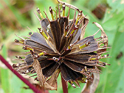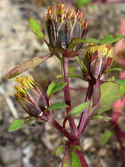 Compact, globular, upwards-pointing flowerheads with many disc florets; initially yellow, maturing to orange and brown. The involucre is enclosed by broad, thin phyllaries, green to purplish, and subtended by a ring of up to eight leaf-like bracts. Occasionally a few bright yellow ray florets may be present