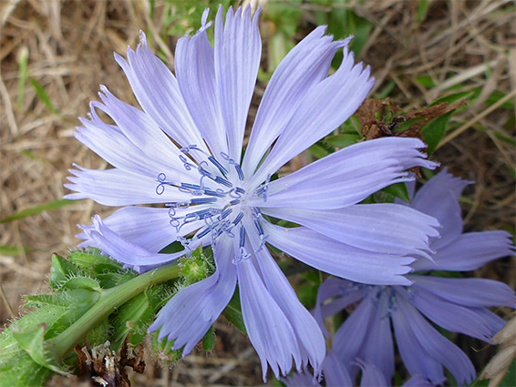 Flowerheads, up to 4 cm in diameter, form at the leaf nodes; they contain 15 to 20 pale blue ray florets, five-lobed at the tip, and with a column of fused, dark blue anthers at the base, from which projects a two-lobed stigma. Phyllaries are of two types; longer, spreading below the florets, and shorter, broader below. All have a sparse covering of bristly hairs