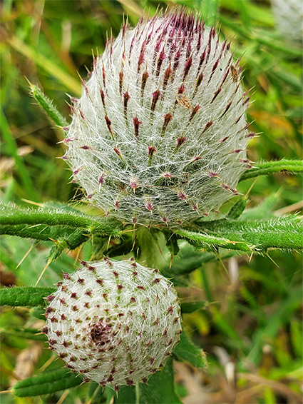 Florets are purple to reddish, atop a large flowerhead (up to 7 cm in diameter) with numerous narrow, spiny bracts below, angled outwards, The space between the bracts is filled with dense cobwebby hairs, obscuring the globular involucre, Stems are grooved, unwinged, and covered with similar hairs