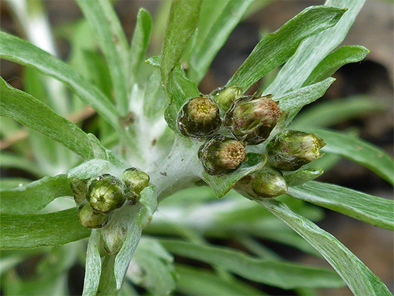 Narrow, linear to oblong, up to 5 cm in length, with a woolly hair covering on both sides. The uppermost leaves are adjacent to the flower clusters, and longer than them