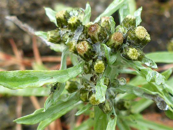 Light brown to yellow, in dense, compact clusters of up to ten heads, at the tips of the branched stem, subtended by the leaves. Phyllaries are brownish-green, with a woolly-hairy coating, and a thin, light-coloured membrane along the edges