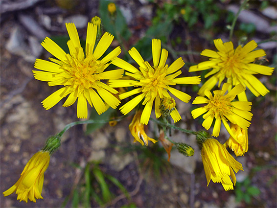 Open clusters of yellow flowerheads attached by hairy pedicels, and subtended by bristly and/or hairy bracts, overlapping, and in several rows. Florets are not red-striped underneath