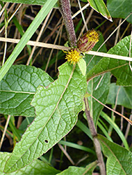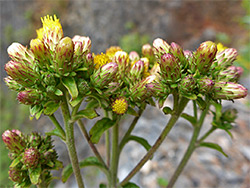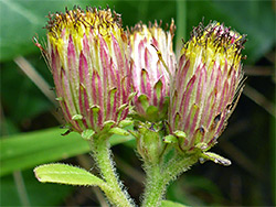 Many small flowerheads, 1 cm in diameter, in dense clusters attached by stout, hairy pedicels. Flowerheads have dark yellow disc florets, tightly packed, and a cylindrical involucre lined by several rows of reddish-green phyllaries; those towards the base are spreading. Very short ray florets may also be present
