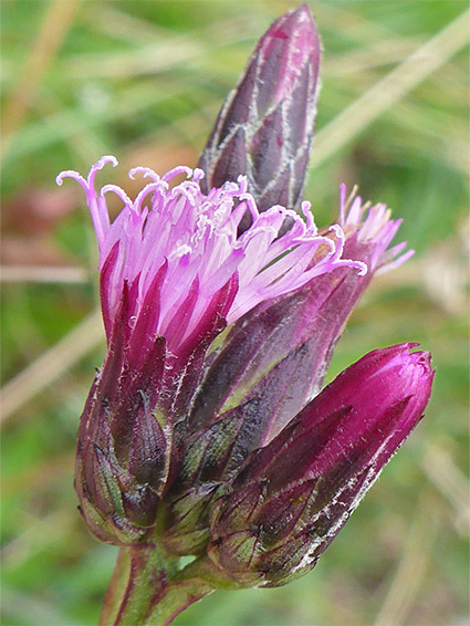 Many narrow, purple-red disc florets, and a narrow involucre ringed by several rows of purplish, spineless bracts, tightly appressed. Surfaces of the bracts are hairless, while margins have short, cottony, white hairs. Flowerheads are few in number, in an open, terminal cluster