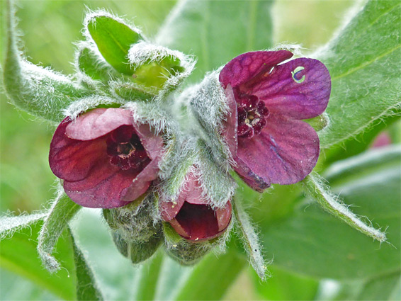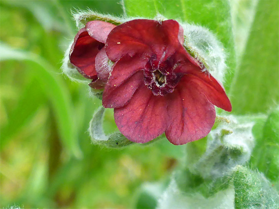 Flowers have a red corolla opening to five obovate lobes, with small, raised appendages at the base; up to 10 mm in diameter. Underneath is a green calyx, divided into five lobes, a little longer than the corolla lobes. Flowers are attached by short stalks, less than 5 mm