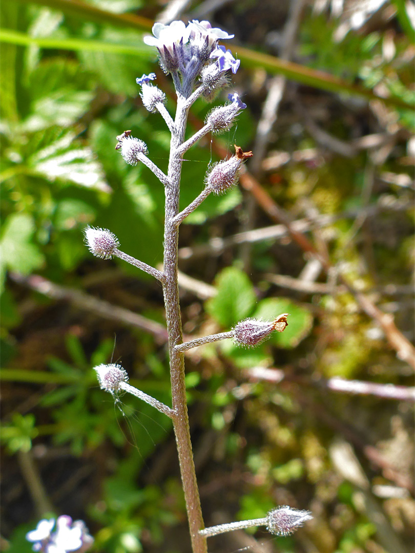Alternate pedicels - upper stem of myosotis-discolor (changing forget-me-not), Lippets Grove Nature Reserve, Gloucestershire