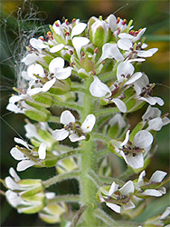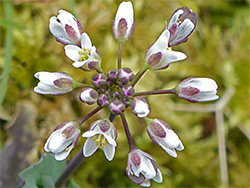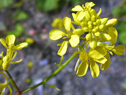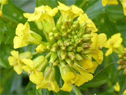 Plants in the brassicaceae, or cruciferae family (common names cabbage, or mustard family) have alternate leaves, hairy or not, and a clustered inflorescence of flowers with four-fold symmetry; four petals, usually white or yellow, in a cross-shape, and four greenish sepals. At the centre are (usually) six stamens and a pistil. Fruits are narrow, cylindrical pods. Many species have edible leaves. About 80 species occur in the British Isles.