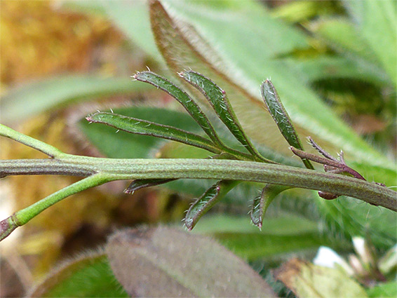 Basal leaves are pinnately divided into an odd number of rounded lobes, while the one to four stem leaves are smaller. Upper leaf surfaces have a sparse hair covering