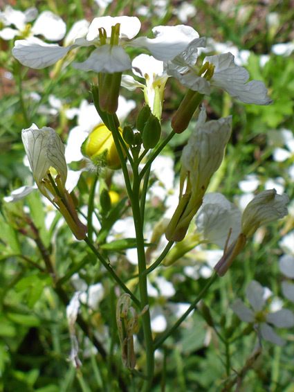 Either pale yellow (ssp maritimus) or white with purple veins (ssp raphanistrum); both varieties have narrow, reddish green sepals bearing a few long, spreading hairs, and are attached by slender, ascending pedicels