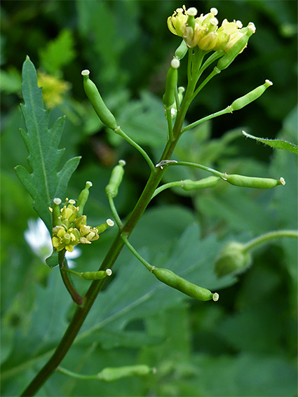 Hairless, cylindrical pods, up to 20 mm long, topped by the residual stigma disc. Attached by ascending stalks of similar length