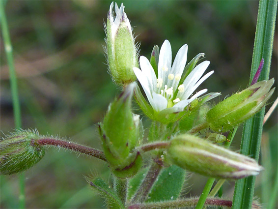 About 7 mm in diameter, with white petals, notched to about a third of the length, and green sepals only slightly shorter than the petals. Sepals are hairy, and lined with a thin, silvery margin. At the centre are ten stamens and five styles. Flowers are produced in small, open clusters