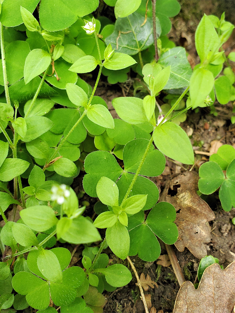 Flowering of stems - moehringia-trinervia, three-nerve sandwort, Woorgreens Lake, Gloucestershire