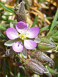 Solitary or in small clusters at the top of the stems; five greenish-purple sepals, and five ovate, pale to dark pink petals, similar in length. At the centre are three styles and ten stamens, toped by transverse yellow anthers. Sepals and pedicels have a dense covering of short, glandular hairs